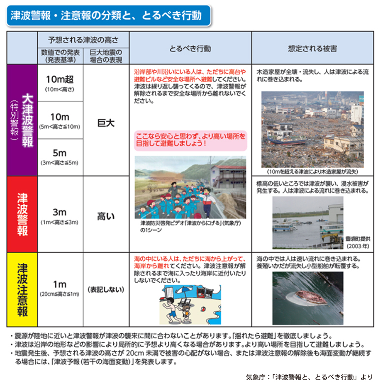 ただし、震源が陸地に近いと津波警報・注意報が津波の襲来に間に合わないことがあります。海の中にいる人は、ただちに海から上がって海岸から離れてください。海の近くで強い揺れや、弱くても長い揺れを感じたときは、急いで安全な場所に避難しましょう。